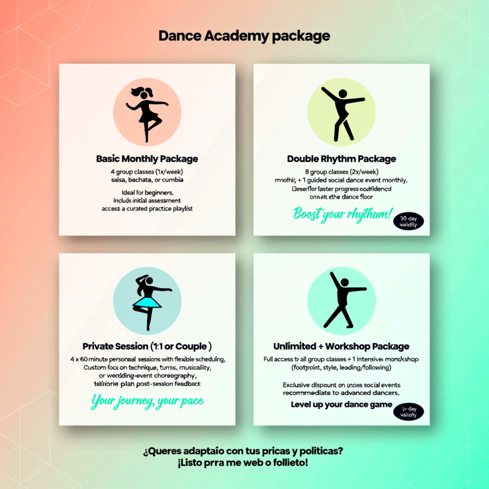 Academia y maestro de baile dedicados a formar bailarines seguros y expresivos en ritmos latinos (salsa, bachata, cumbia) y estilos complementarios. Combinan técnica, musicalidad y pedagogía moderna para que cada alumno avance con claridad, disfrute el proceso y construya comunidad dentro y fuera de la pista.